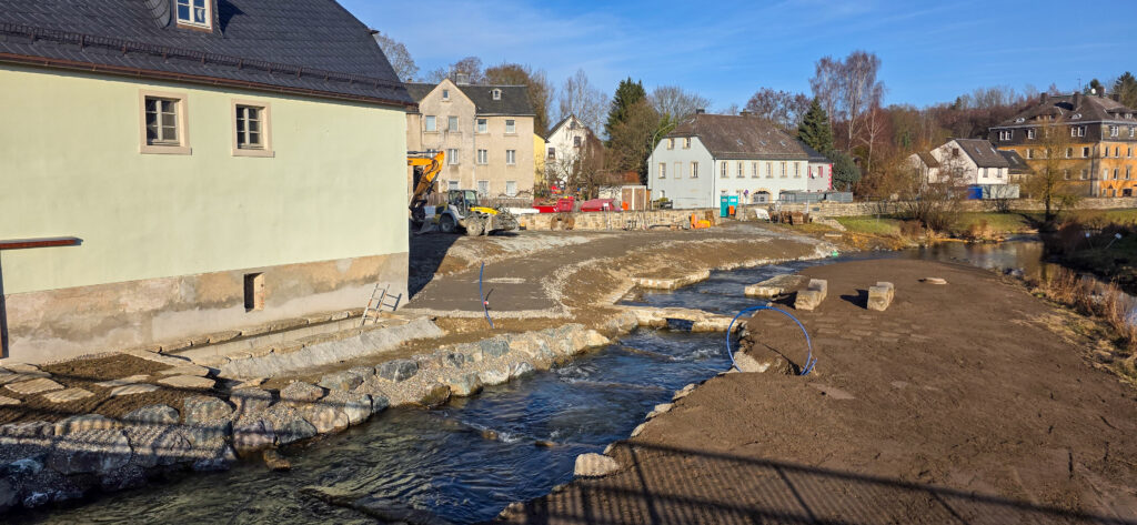 Die Arbeiten schreiten insgesamt zügig voran. Besonders erfolgreich ist bereits die Fertigstellung der Fischtreppe an der Stegmühle, die Teil des laufenden ökologischen Umbaus der Saale ist.
