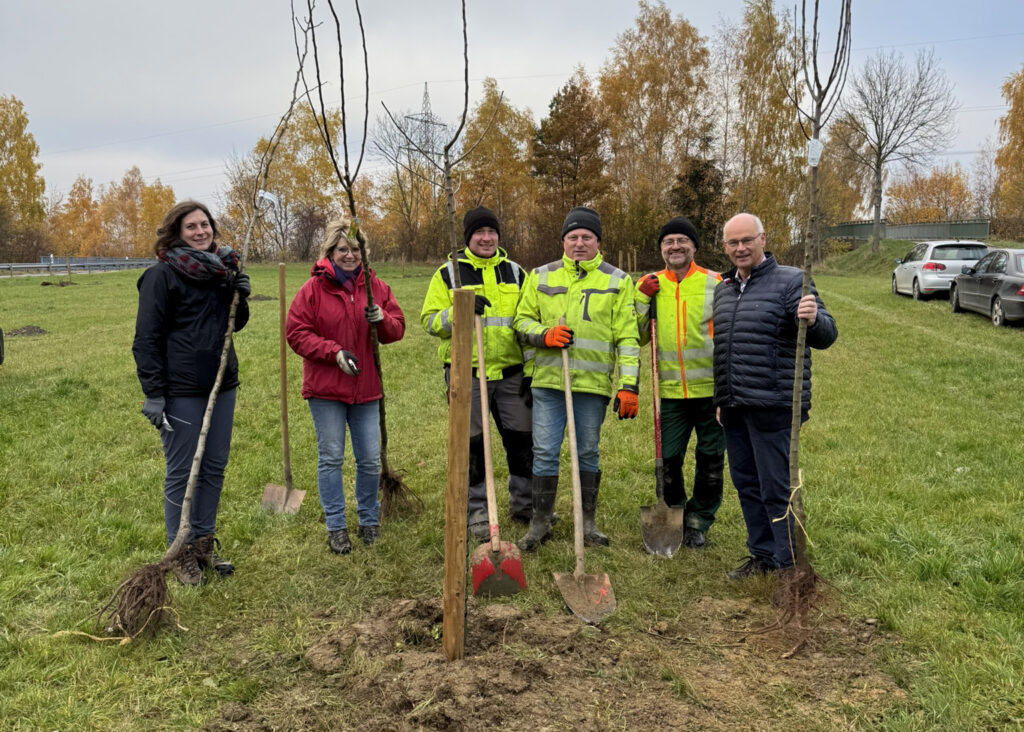 Auf Initiative von Bürgermeister Hans-Peter Baumann wurde auf einem städtischen Grundstück eine neue Streuobstwiese angelegt. Auf der Wiese zwischen der Frankenstraße und der Firma Nützel pflanzten Mitarbeitende des Landschaftspflegeverbands insgesamt 32 Obstbäume.