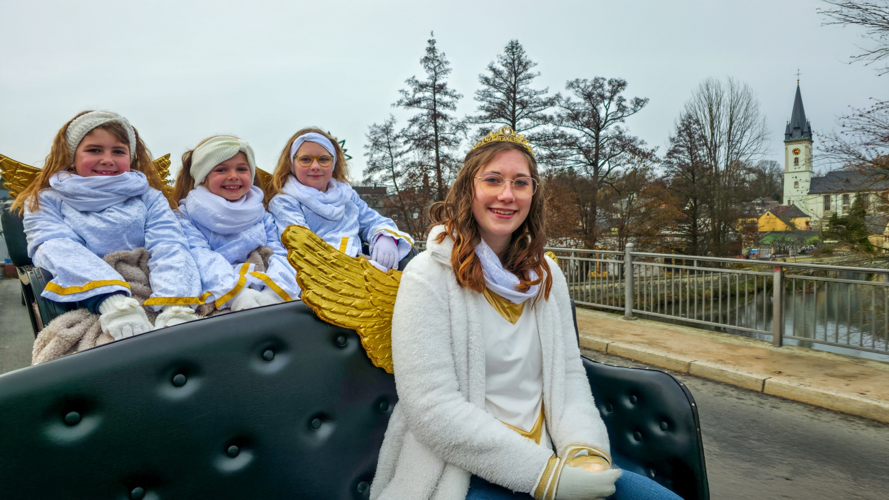Ein besonders liebgewonnener Moment: Nikolaus Matthias Popp fuhr mit der Kutsche vor – abgeholt von Christkind und Engeln. Er kam nur ein paar Meter weit, da hatte sich schon eine fröhliche Traube von Kindern gebildet. Viele durften sich über eine kleine Überraschung aus dem Sack freuen – und über ein Foto obendrein.