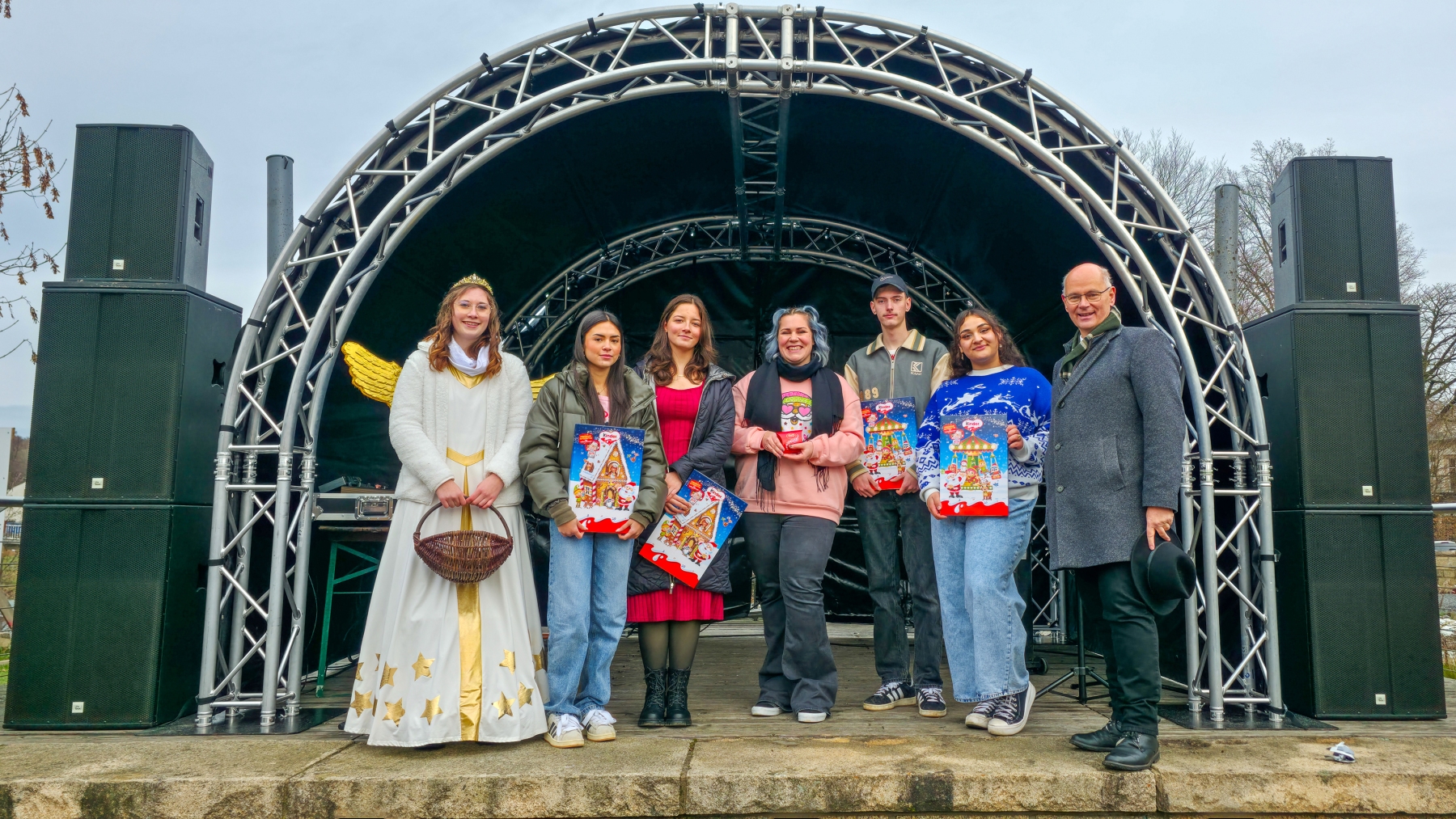 Zum Abschluss versammelten sich erneut die Engelchen, das Christkind, der Nikolaus und Erster Bürgermeister Hans-Peter Baumann auf der Bühne, umrahmt vom Schwarzenbacher Posaunenchor. In dieser stimmungsvollen Runde dankte der Bürgermeister allen Mitwirkenden und Helfenden: