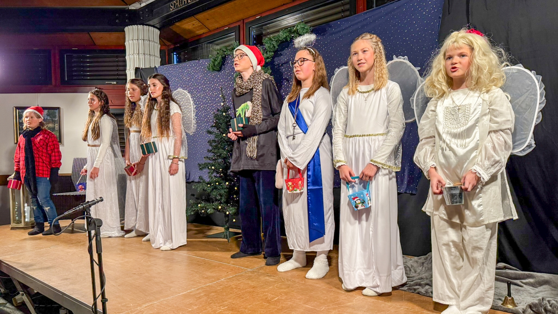 Zum Abschluss versammelten sich erneut die Engelchen, das Christkind, der Nikolaus und Erster Bürgermeister Hans-Peter Baumann auf der Bühne, umrahmt vom Schwarzenbacher Posaunenchor. In dieser stimmungsvollen Runde dankte der Bürgermeister allen Mitwirkenden und Helfenden: