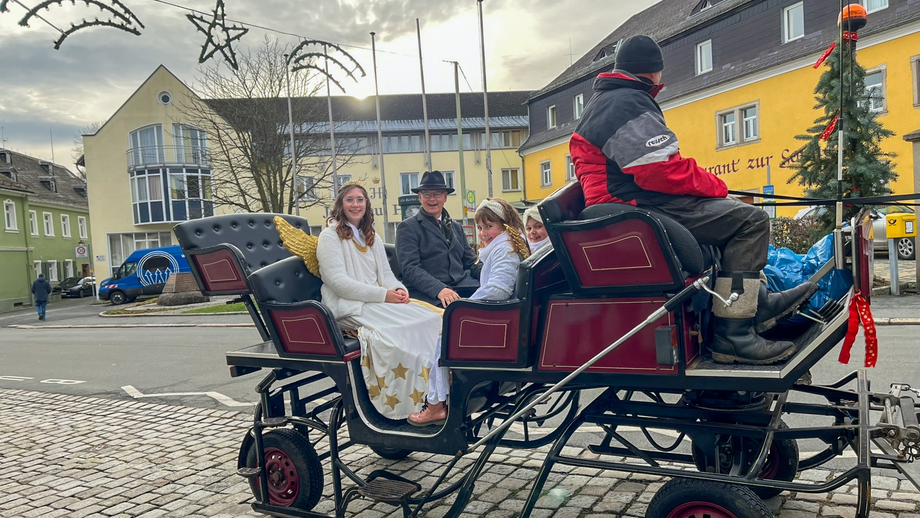Ein besonders liebgewonnener Moment: Nikolaus Matthias Popp fuhr mit der Kutsche vor – abgeholt von Christkind und Engeln. Er kam nur ein paar Meter weit, da hatte sich schon eine fröhliche Traube von Kindern gebildet. Viele durften sich über eine kleine Überraschung aus dem Sack freuen – und über ein Foto obendrein.