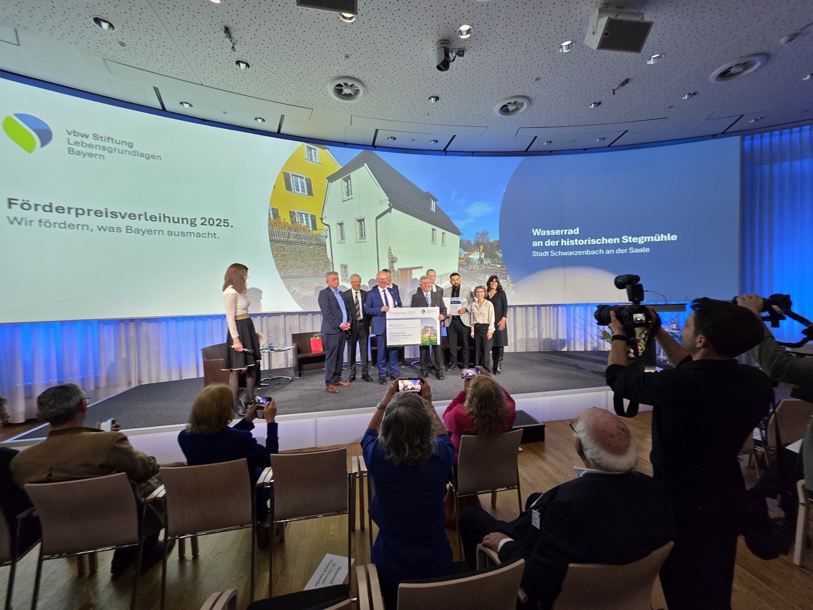„An der historischen Stegmühle in Schwarzenbach an der Saale entsteht ein Wasserrad, das historische Technik, Denkmalschutz und Umweltbildung miteinander verbindet. Die Funktionsweise der Wasserkraft wird anschaulich erlebbar und hat einen ganz praktischen Nutzen: Das Rad stellt ohne zusätzlichen Energieeinsatz und ohne Verwendung von Trinkwasser das flüssige Element aus der Saale für den angrenzenden entstehenden Wasserspielplatz bereit und bewässert gleichzeitig eine entstehende Feuchtwiese, auf der sich eine artenreiche Vegetation entwickeln kann. So entsteht ein Lern-, Erlebnis- und Begegnungsort, an dem Kinder spielerisch Natur und Technik erkunden, während Familien und Besucherinnen und Besucher die ökologische und historische Bedeutung der Saale neu entdecken. Die Stiftung fördert das Projekt, weil es Hochwasserschutz, Ökologie, Stadtkultur und Umweltbildung überzeugend verbindet.“