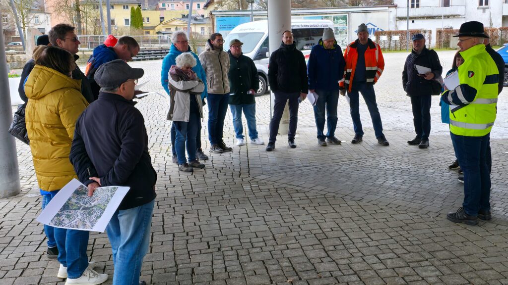Bei einer gemeinsamen Ortsbegehung stimmen sich Organisatoren und Verantwortliche über die Umsetzung des Kreisgartentages in der Schwarzenbacher Altstadt ab.