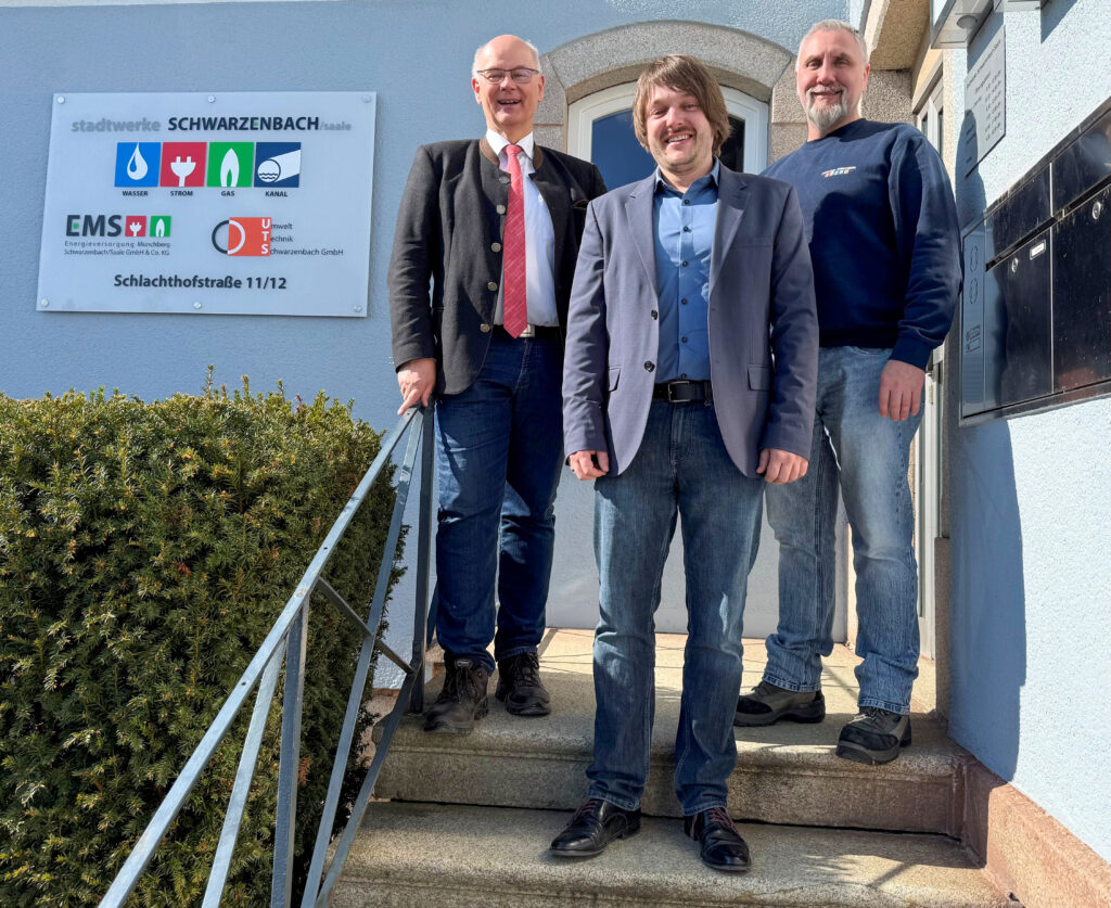Mit Beschluss des Stadtrates in der Märzsitzung wurden Tobias Bertl und Oliver Schmidt zu Werkleitern der Stadtwerke Schwarzenbach bestellt. Bürgermeister Hans-Peter Baumann begrüßte die beiden nun offiziell am Eingang der Stadtwerke.