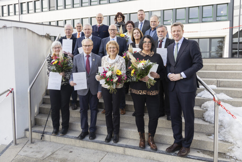 Erste Reihe v. l.: Gisela Falkenberg aus Schwarzenbach an der Saale, Reinhold Rittweg und Angela Wunner aus Schwarzenbach am Wald, Nadja Rudolph aus Zell im Fichtelgebirge und Landrat Dr. Oliver Bär; Zweite Reihe v. l.: Klaus Reithmeier, Manfred Lang und Oliver Münchberger aus Schwarzenbach an der Saale, Regina Hager aus Weißenstadt, Werner Kreil aus Zell im Fichtelgebirge; Dritte Reihe v. l.: Bürgermeister Karl-Philipp Ehrler aus Stammbach, Bürgermeister Hans-Peter Baumann aus Schwarzenbach an der Saale, Mitorganisatorin der Ehrung Sandra Leucht sowie Bürgermeister Reiner Feulner aus Schwarzenbach am Wald.