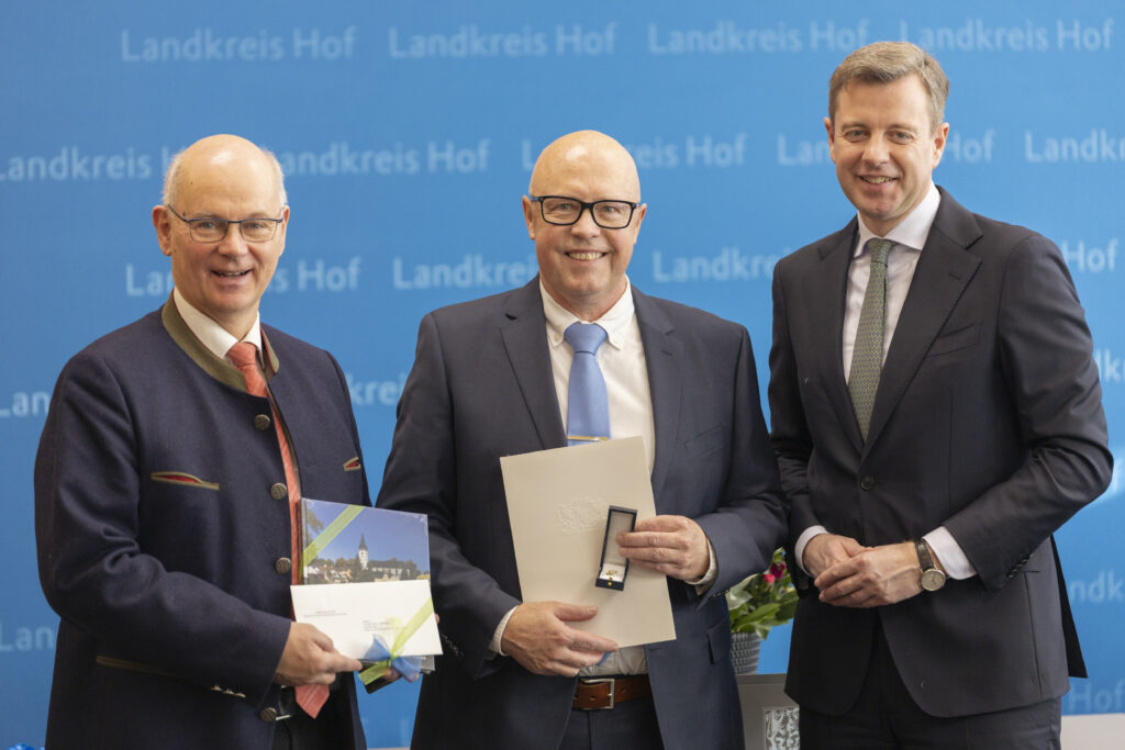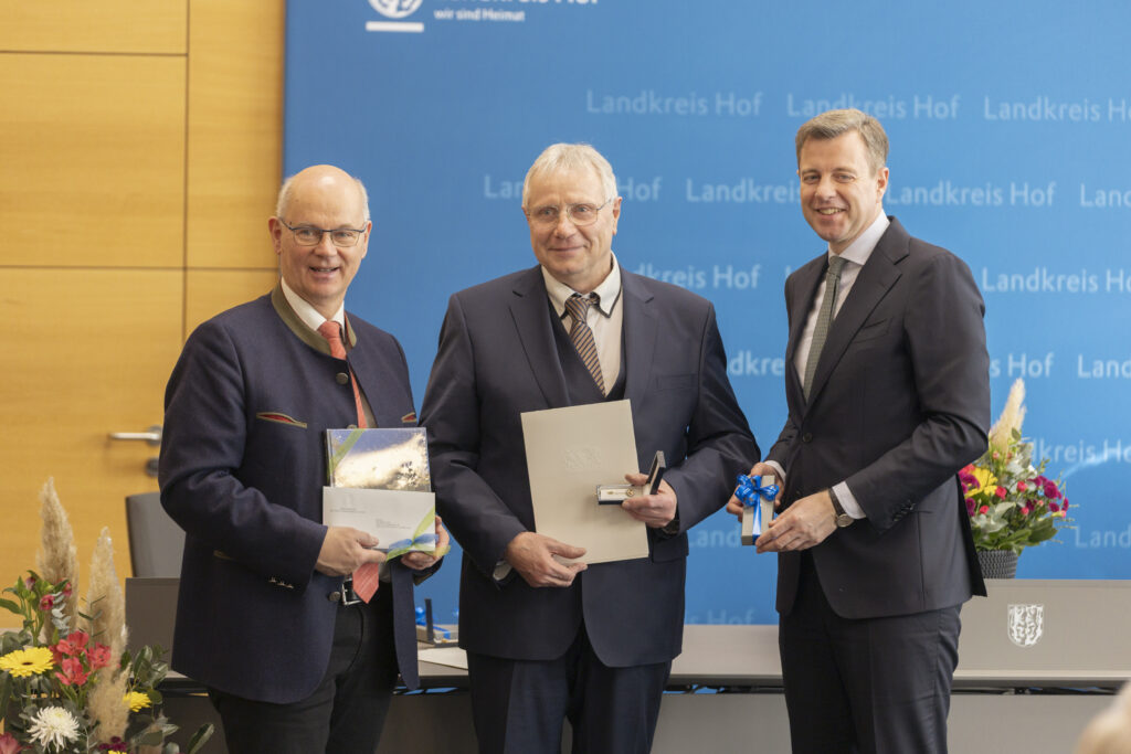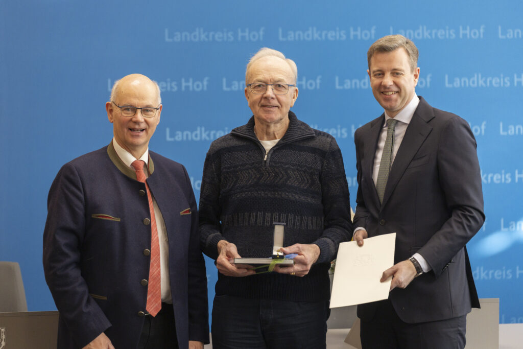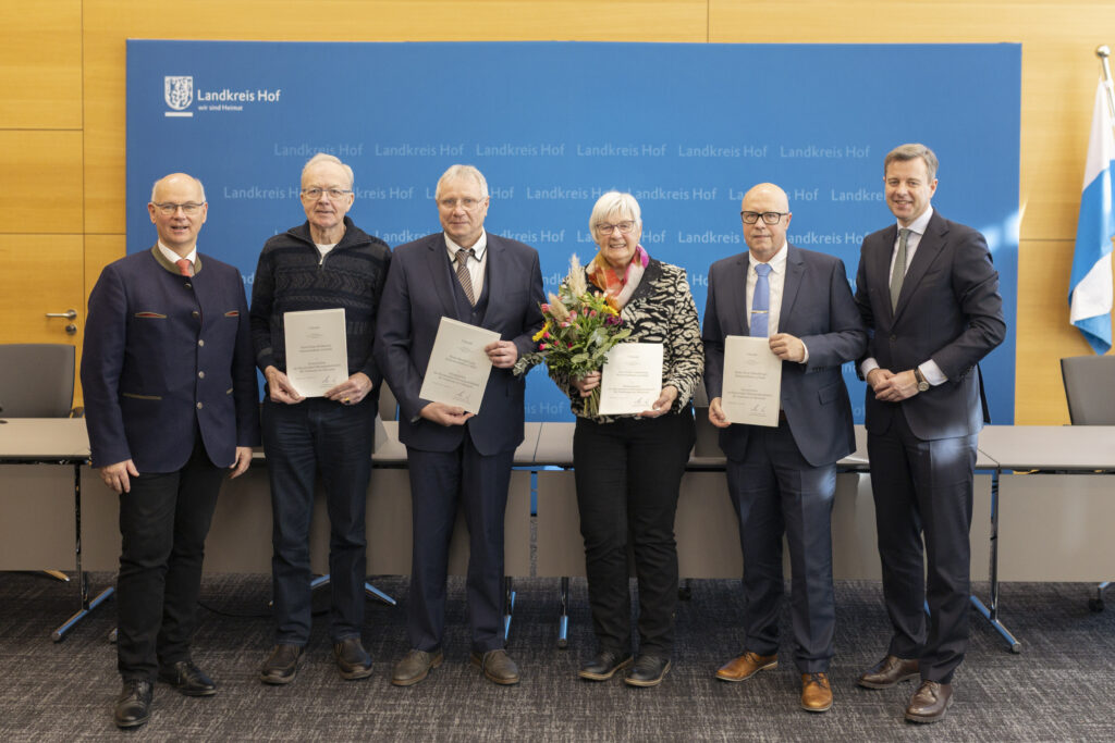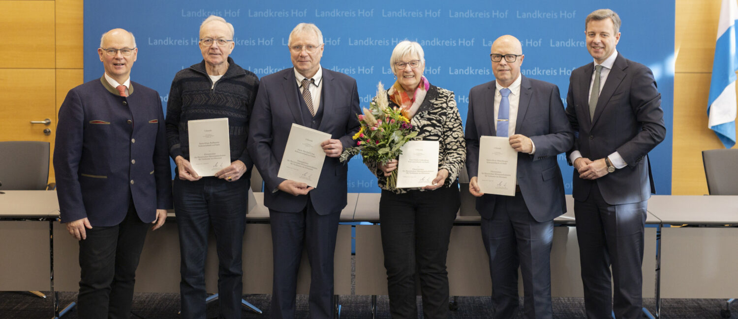 Für ihr langjähriges und herausragendes ehrenamtliches Engagement im Landkreis Hof wurden Persönlichkeiten mit einer besonderen Auszeichnung geehrt. Landrat Dr. Oliver Bär verlieh ihnen im feierlichen Rahmen das Ehrenzeichen des Bayerischen Ministerpräsidenten. An der Veranstaltung im Sitzungssaal des Landratsamtes Hof nahmen neben den Geehrten auch Vereinsmitglieder, Partnerinnen und Partner, Familienangehörige sowie die Bürgermeisterinnen und Bürgermeister der Heimatgemeinden teil.