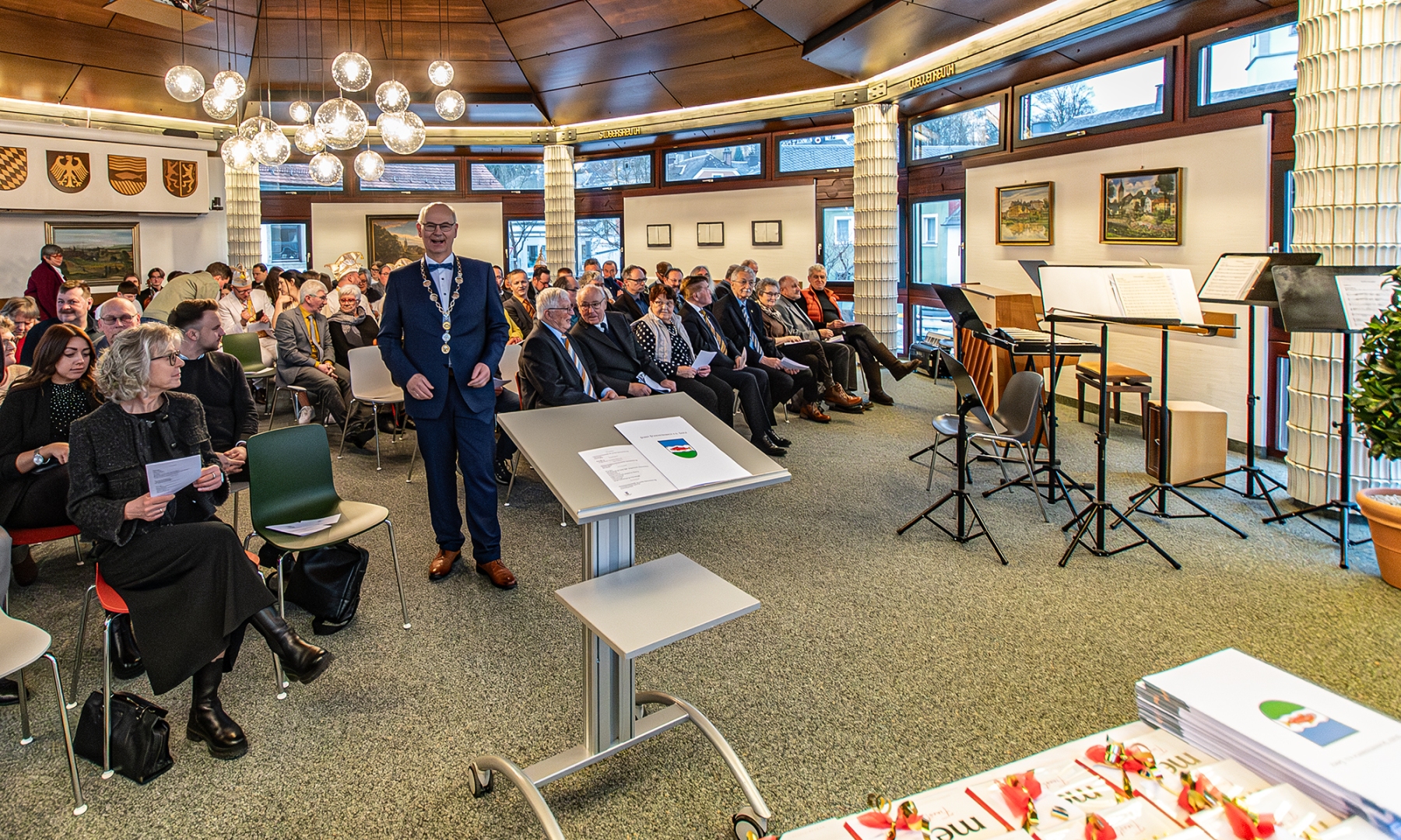 Erster Bürgermeister Hans-Peter Baumann begrüßte zahlreiche Gäste aus Politik, Kirche, Schulen, Vereinen und Verwaltung sowie die Geehrten mit ihren Begleitungen, darunter Dr. Oliver Bär und der Landtagsabgeordnete Kristan von Waldenfels sowie die Ehrenbürger Dr. Sandler und Dieter Seuß.