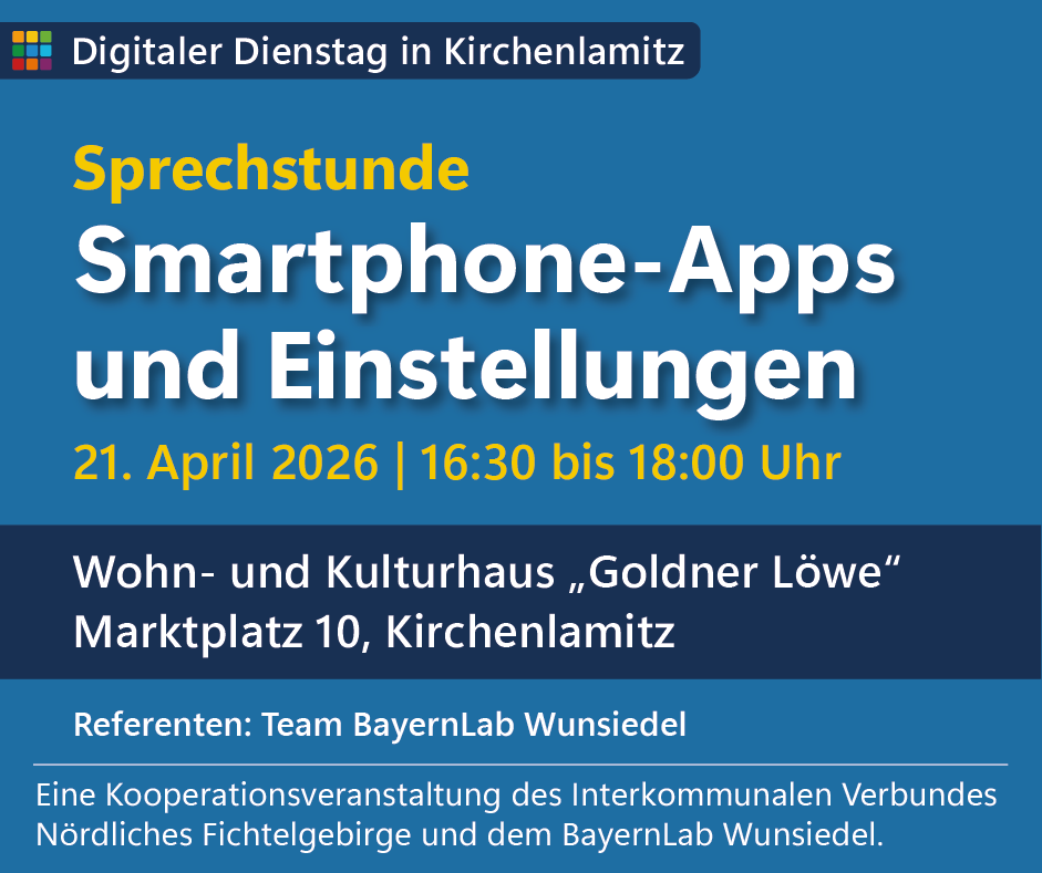 Der Interkommunale Verbund Nördliches Fichtelgebirge lädt gemeinsam mit dem BayernLab Wunsiedel zu einer Smartphone-Sprechstunde ein.